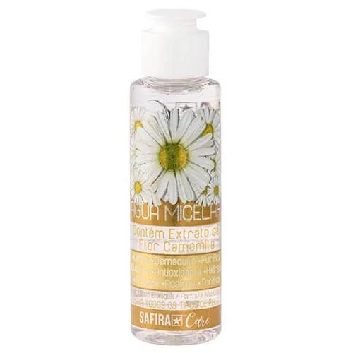 A Água Micelar Safira (100ml) é uma solução de limpeza facial 3 em 1 (limpa, demaquila e tonifica) com extrato de camomila, ideal para todos os tipos de pele, incluindo sensíveis. Sua fórmula sem enxágue remove impurezas e maquiagem leve, ação antioxidante, calmante e hidratante. Pode ser usada diariamente, de manhã e à noite.