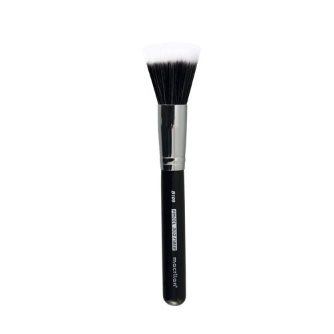 Pincel Profissional Duo Fiber Po Blush etc Macrilan B109 - UnitarioIndicado para aplicar blush em po ou cremoso, po facial, base liquida, base bronzeadora e iluminador. Tambem pode ser utilizado para acabamento e polimento.Feita com 2 tipos de cerdas sinteticas para um acabamento suave e uma maquiagem impecavel.Modelo: Cerdas Sinteticas